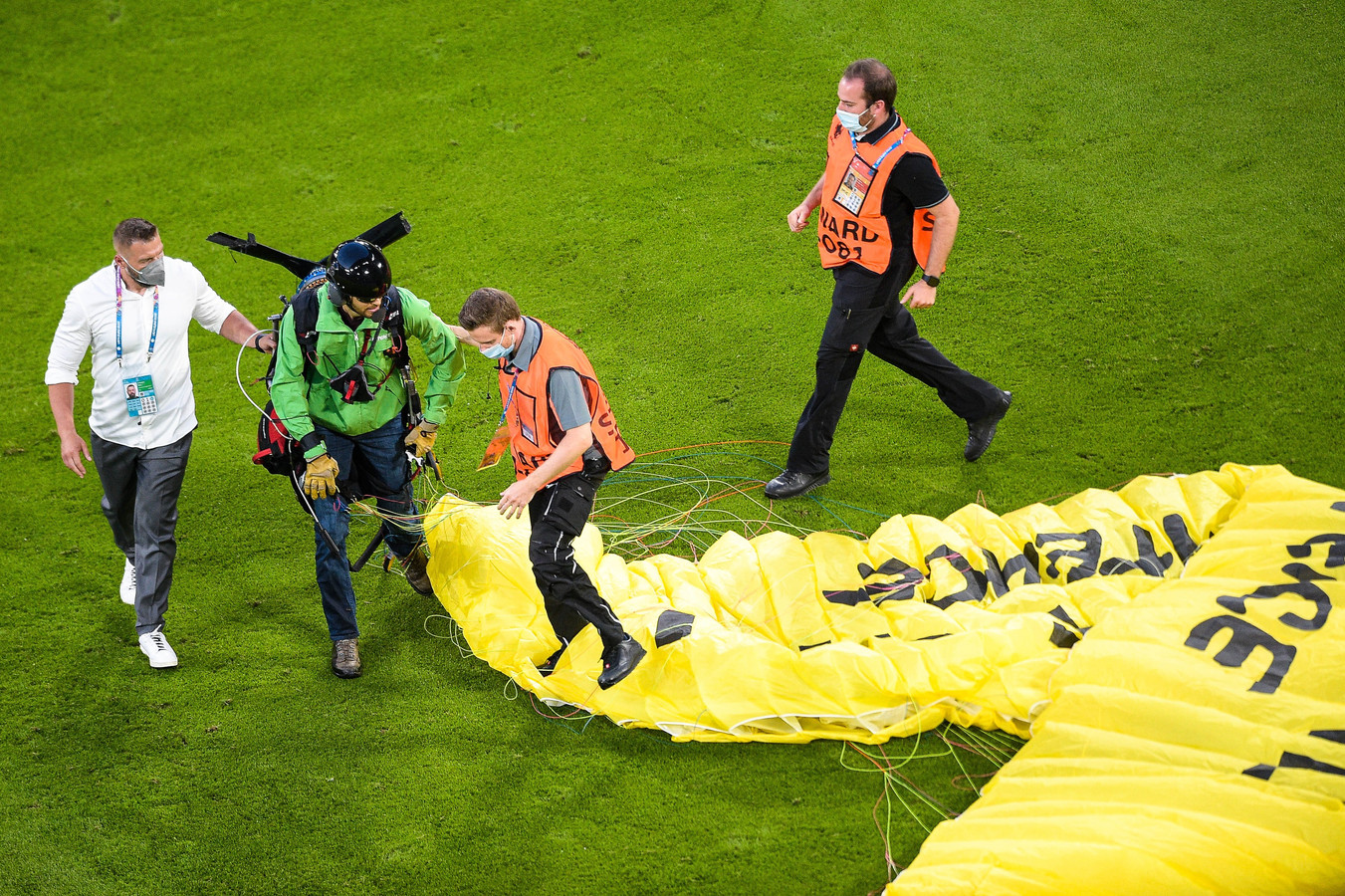 Un militant de greenpeace a failli s'écraser sur la pelouse de l'allianz arena, quelques minutes avant le début du match entre l'allemagne et la france.